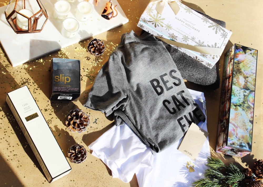 For the things for the days you don’t want to leave your home, I decided to order the comfiest loungewear; I ordered these sweats from Barefoot Dreams and I swear I never felt sweatpants so soft, I want a pair now too! They were expensive, over $100, but the quality is unreal and I know she’ll live in them! As for the cat t-shirt, I got that off Etsy, and know she’ll love it as she has three cats and is a self-declared fur mama – the t-shirt is so cozy and soft and the Etsy shop I got in from was the cutest (WildWhiskersBoutique), I loved their packaging and the little thank you note they sent, plus the shipping was so fast. I also got her a Monki shirt with little paw prints on them. Then, I got her a set of mini holiday candles from Jo Malone from Nordstrom – it’s a variety pack with some of their most popular scents and I love all of them, especially the Sweet Almond & Macaroon, Peony & Blush Suede, and the Grapefruit! They were kind of expensive, especially since they’re just minis, but I love to splurge on candles for a nice holiday gift. I also got her a holiday themed Sugarfina box, which I’m struggling to save for Christmas, I really hope she shares – it has pumpkin caramels, champagne bears, and sugar cookie candies. Lastly I got her a luxury dry shampoo that is supposed to be amazing by Oribe and some silk hair ties from Slip that help prevent damaging hair! Overall, I love the way this theme turned out and can’t wait to see her reaction, not to mention this is the type of gift I love to receive, totally useful things, but that are just a little nicer than what we normally buy ourselves, all in the spirit of Christmas.