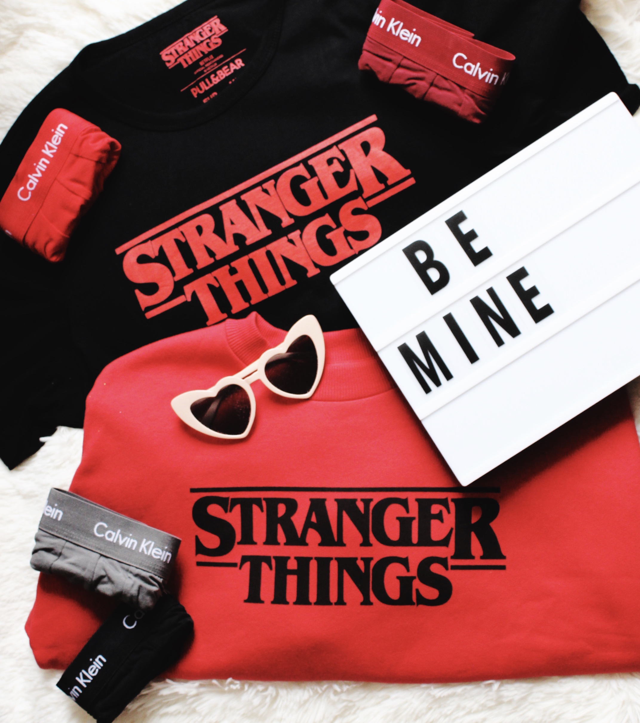 Happy Valentine’s Day everyone! Believe it or not, Darren and I have never ever spent a Valentine’s Day together and we’ve been together for nearly 5 years! What can I say? We both work retail jobs and the year or two we made late night dinner plans a snow storm got in our way. The good news? Darren has helped me realize that Valentine’s Day isn’t so important if you show the person you love how much you love them everyday and not just on February the 14th. Either way, we both love an excuse to get the other a gift. This year I decided to make Darren a box for a “night-in,” with matching PJ’s – we love Stranger Things and this Pull&Bear logo t and sweatshirt are perfect, some new boxers by Calvin Klein in v V-day colors, it looks like the ones I got are sold out, but these are similar, and the only thing missing from this picture as I’ve yet to pick it up – some chocolates to share!